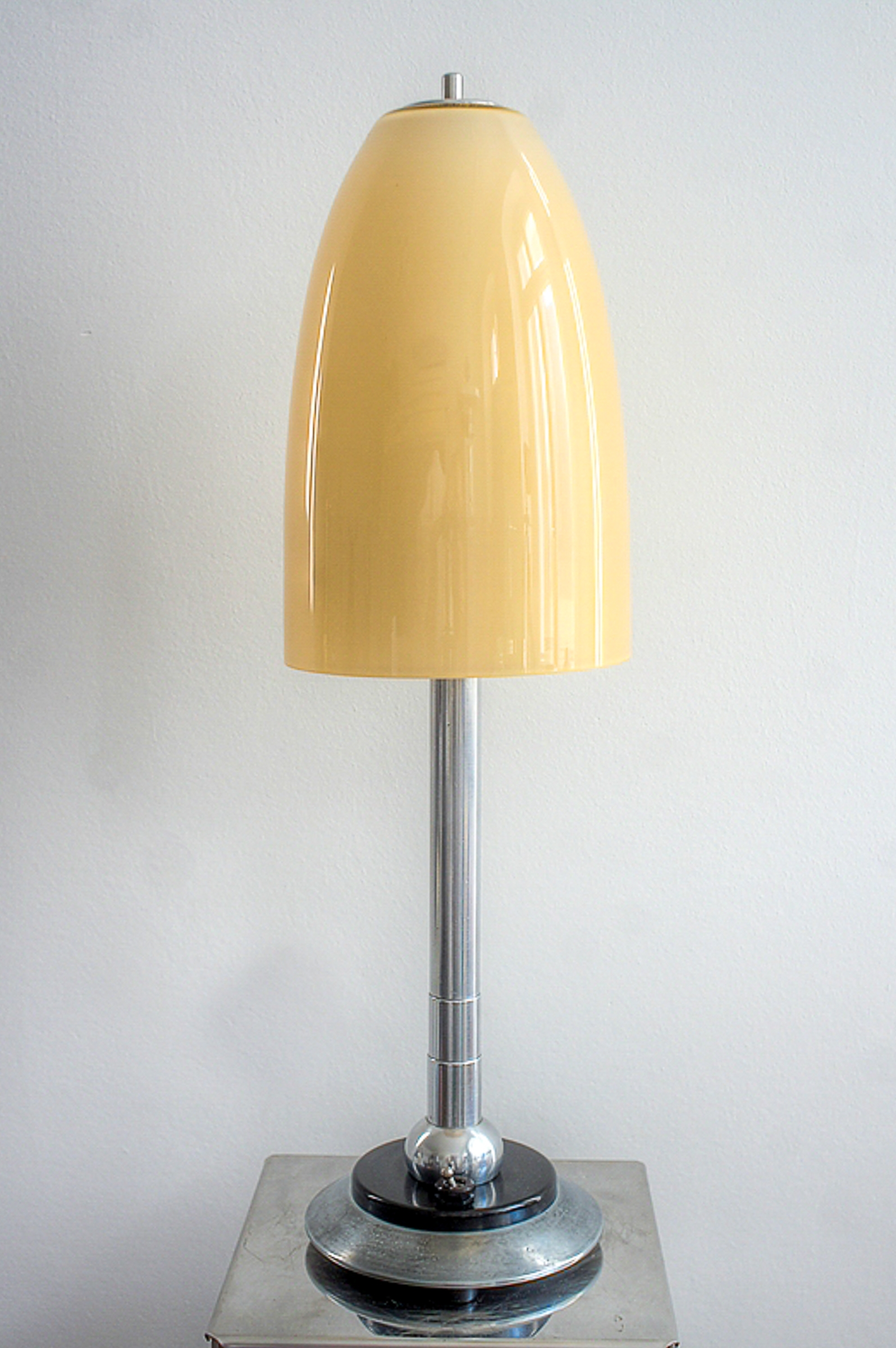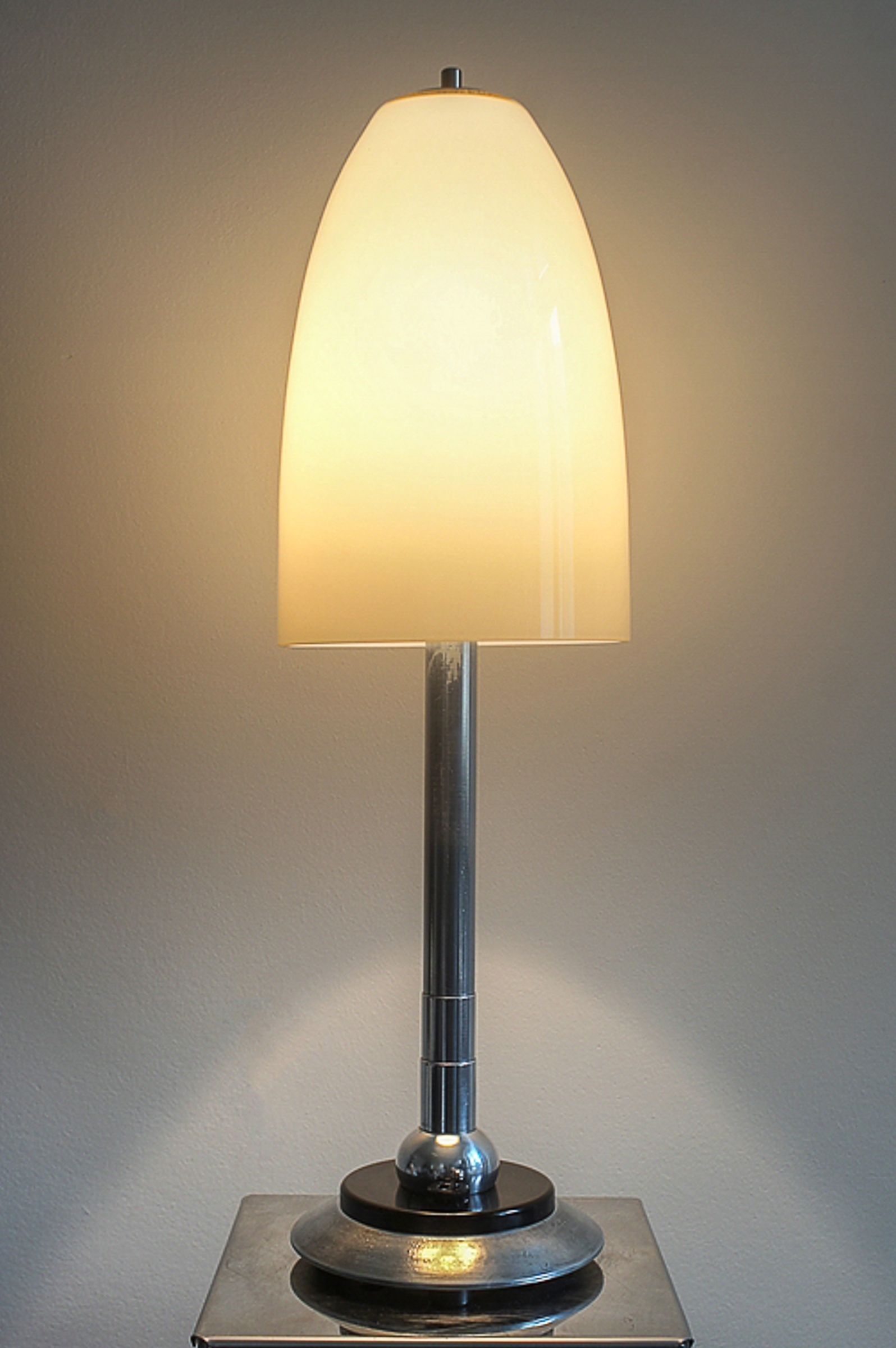 Funktionalismus als Symbiose der Epochen. Die Tischleuchte „Morchel“ zeigt sich als Schmelzpunkt von Art Nouveau, Art-Deco und Neuer Sachlichkeit und dürfte Ihren Ursprung in den späten 1920er Jahren haben. Die genannten Epochen werden in einem strikten Funktionalismus interpretiert und verzichten auf jegliche Ausarbeitung. Durch die Verwendung von Aluminium, Glas und Bakelit werden die nüchternen Komponenten zu einer hochwertigen Einheit in vollendeter Form der Moderne vereint.